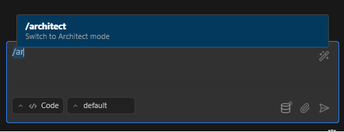 /architect,/ask,/debug, or/codein the chat input