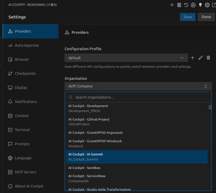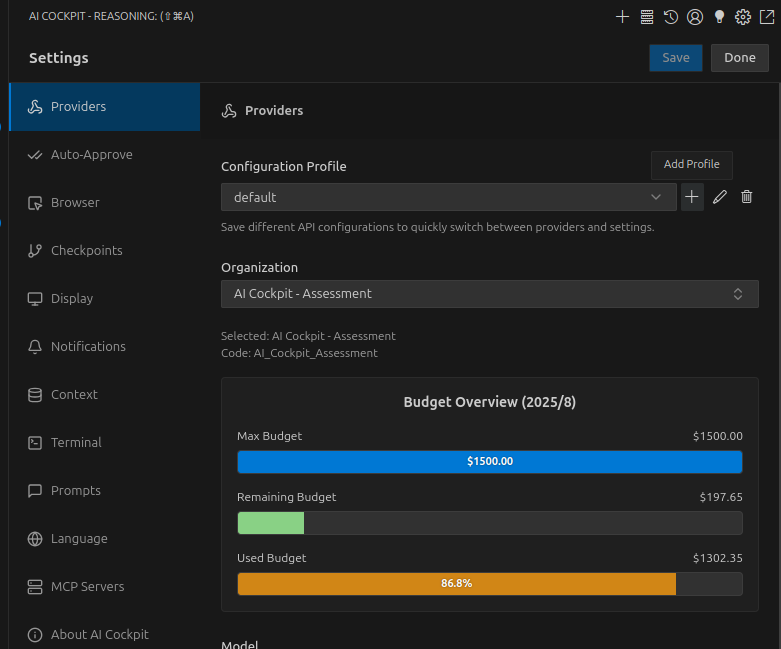 API Configuration Profiles allow you to create and switch between different sets of AI settings. Each profile can have different configurations for each mode, letting you optimize your experience based on the task at hand.
