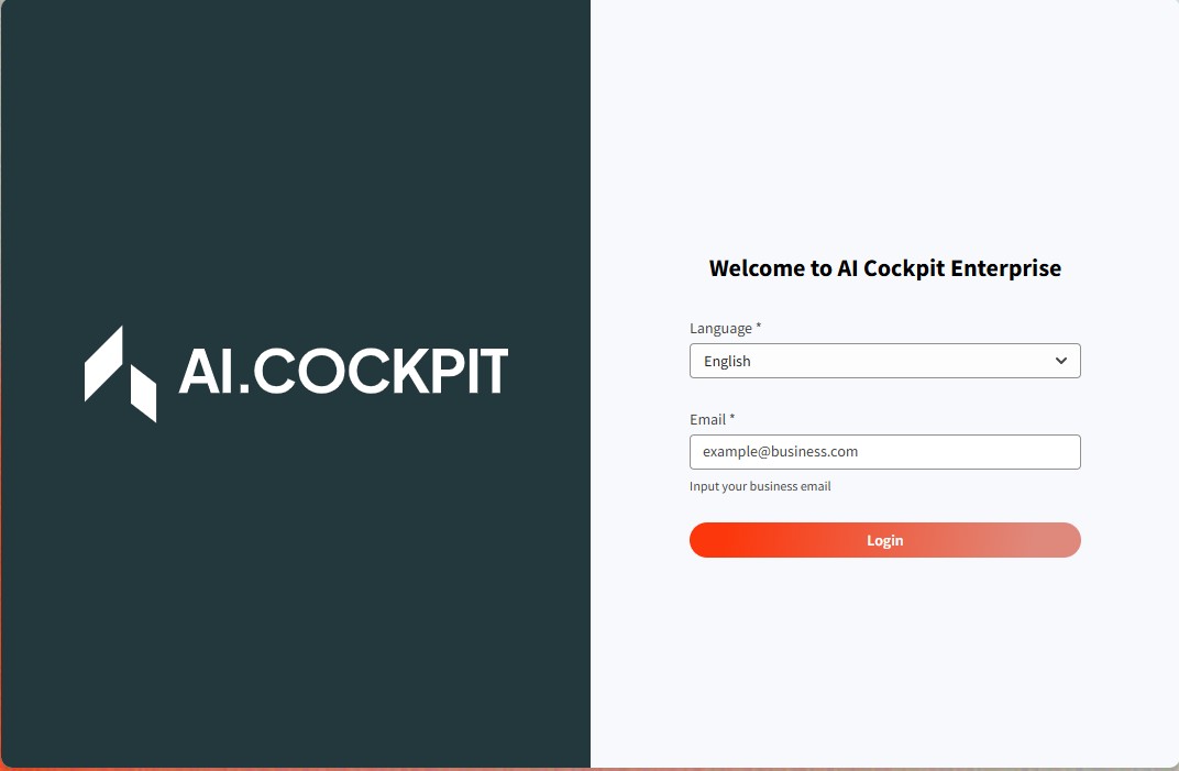 After validating your business e-mail you will be redirect to the AI Cockpit home page.