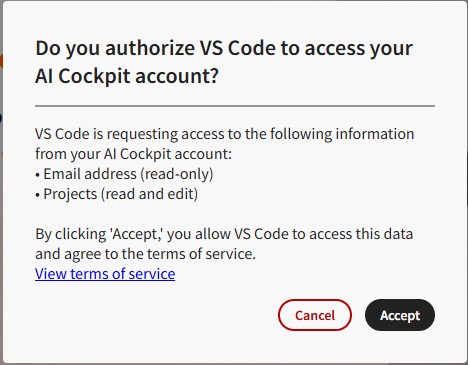 AI Cockpit will ask you to authoryze vs code to have access to your account, click on the "Accept" button.