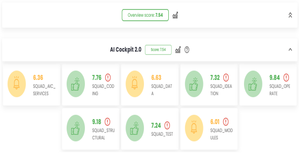 The Score page within the Metrics module provides an overview of the scores for each team and tribe within an organization. It also aggregates an overall score for the organization, calculated as the average score of all the teams that make it up.
