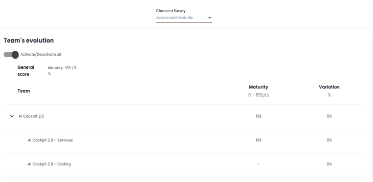 This page allows tracking the team’s evolution based on the values entered in the maturity matrix over time. The figure below shows how the screen appears.
