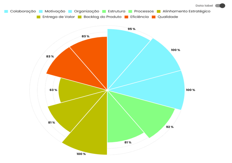 This item of the Metrics module provides a comprehensive view of the teams’ development in relation to their maturity. It allows tracking of indicators through graphs and tables, in addition to offering a broad perspective on the evolution of each team over time.