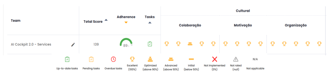 On the left side, you have a list of indicators that make up the squad’s maturity, separated by themes, sub-themes, and items within each sub-theme. For each item, you can check whether the deadlines are being met and the percentage of efficiency relative to the indicator.