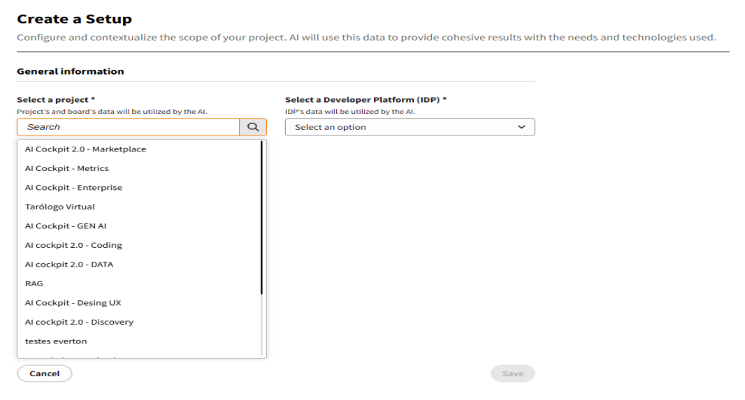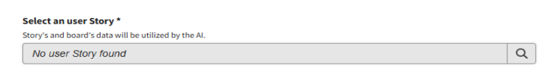 Integration with Management PlatformsWhen a management platform is linked, the "Describe Your User Story" field becomes a dropdown menu populated with stories from the selected project, ensuring contextually relevant selections.