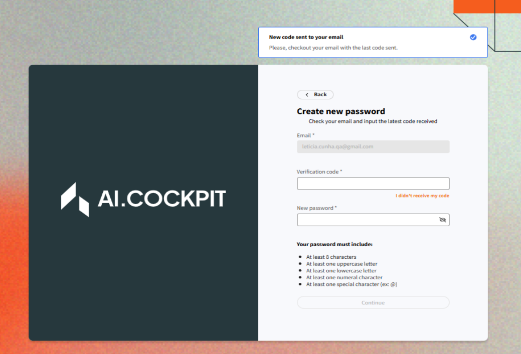 After entering the code and your new password, click "Continue." You will be redirected to the login page to sign in with your new credentials.