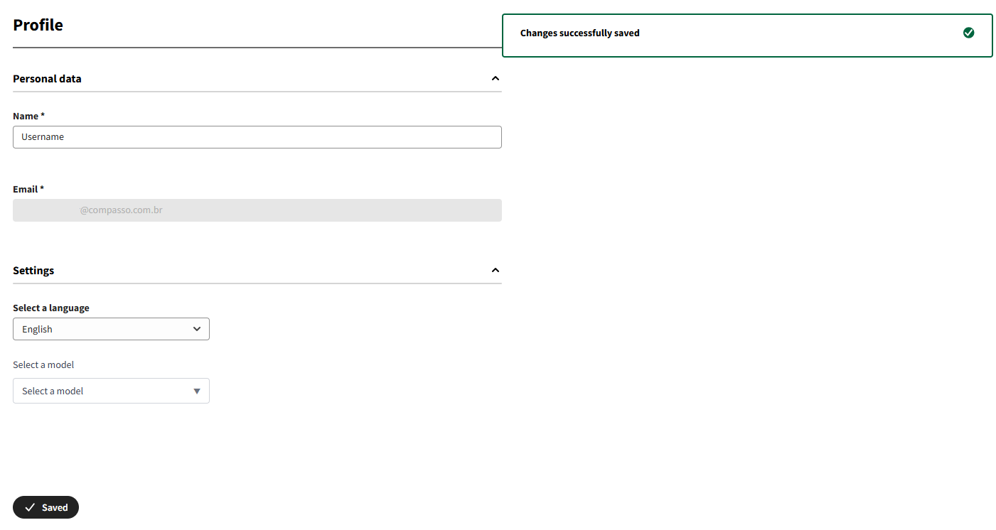 The profile module allows you to manage your personal information, language preferences, AI model selection, and associated providers.