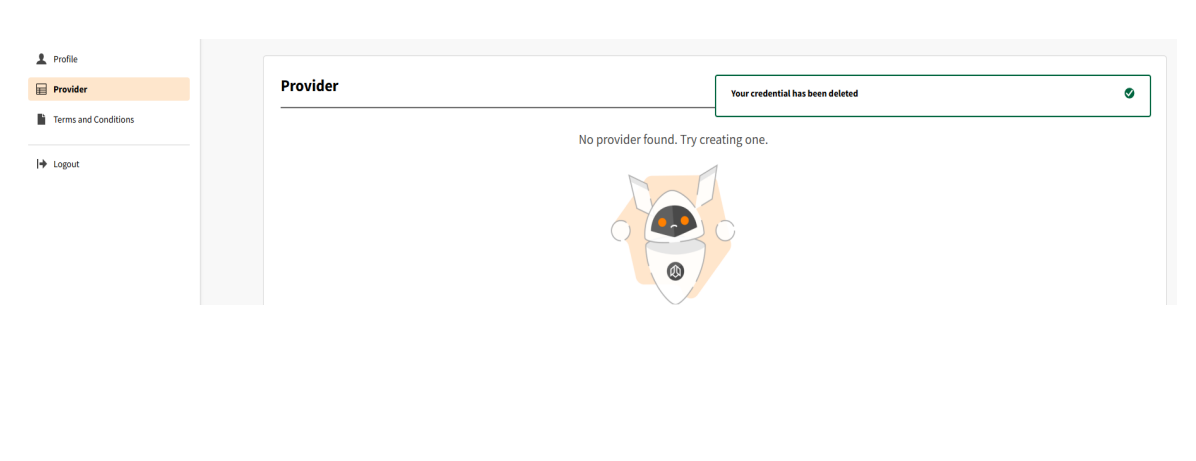 Click Delete again in the modal to confirm. The provider will be removed from the list, and a success alert will be displayed.