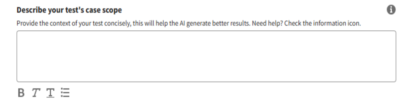 Describe the Context (Optional): Provide additional details to help the AI generate more accurate and relevant test cases. A help icon is available for guidance.