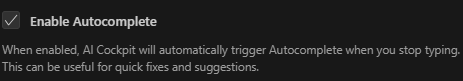Quando ativado, o AI Cockpit acionará automaticamente o Autocomplete quando você parar de digitar. Isso pode ser útil para correções rápidas e sugestões.
