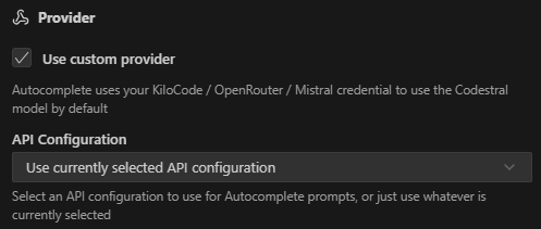 Por padrão, o Autocomplete usa o modelo Codestral através das credenciais KiloCode / OpenRouter / Mistral. Você pode optar por usar um provedor personalizado.