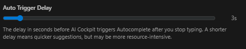 Você pode definir o atraso em segundos antes que o AI Cockpit acione o Autocomplete depois que você parar de digitar. Um atraso menor significa sugestões mais rápidas, mas pode consumir mais recursos.