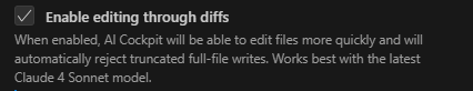 Se você desmarcar Habilitar edição através de diffs, o AI Cockpit voltará a escrever o conteúdo inteiro do arquivo para cada edição usando a ferramenta write_to_file, em vez de aplicar alterações direcionadas com apply_diff. Essa abordagem de escrita completa é geralmente mais lenta para modificar arquivos existentes e leva a um maior uso de tokens.