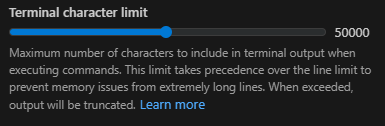 Número máximo de caracteres a serem incluídos na saída do terminal ao executar comandos. Este limite tem precedência sobre o limite de linhas para evitar problemas de memória com linhas extremamente longas. Quando excedido, a saída será truncada. Padrão: 50000 caracteres.