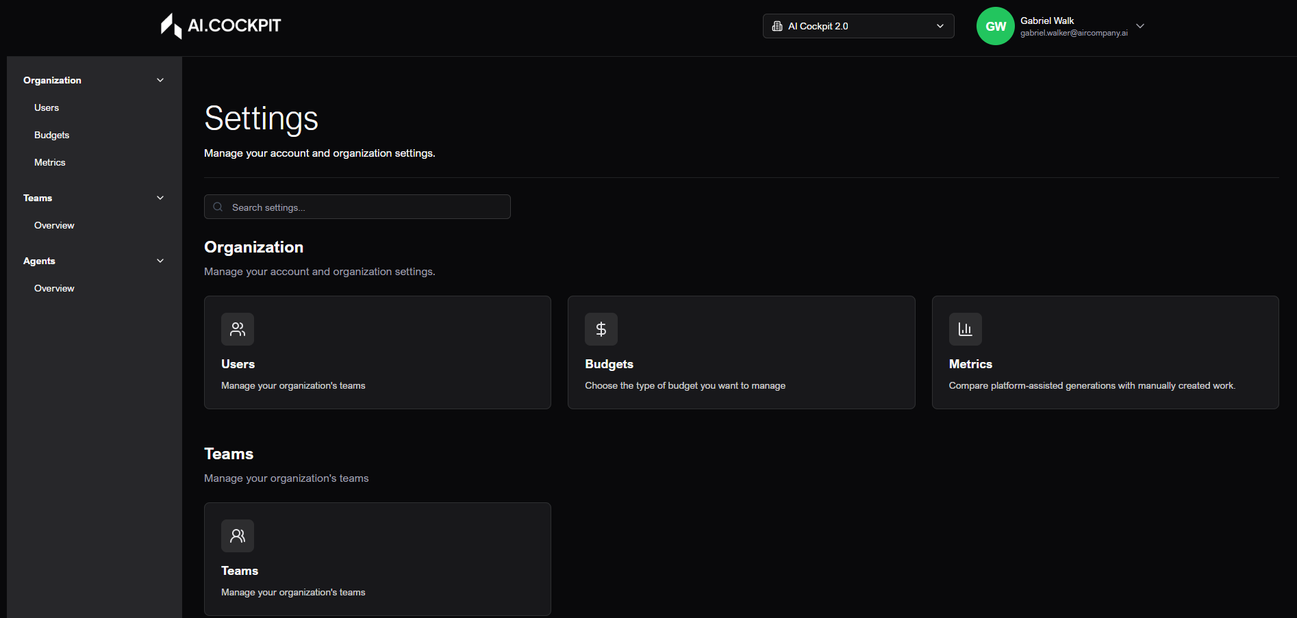 O módulo de configurações centraliza a administração da organização.