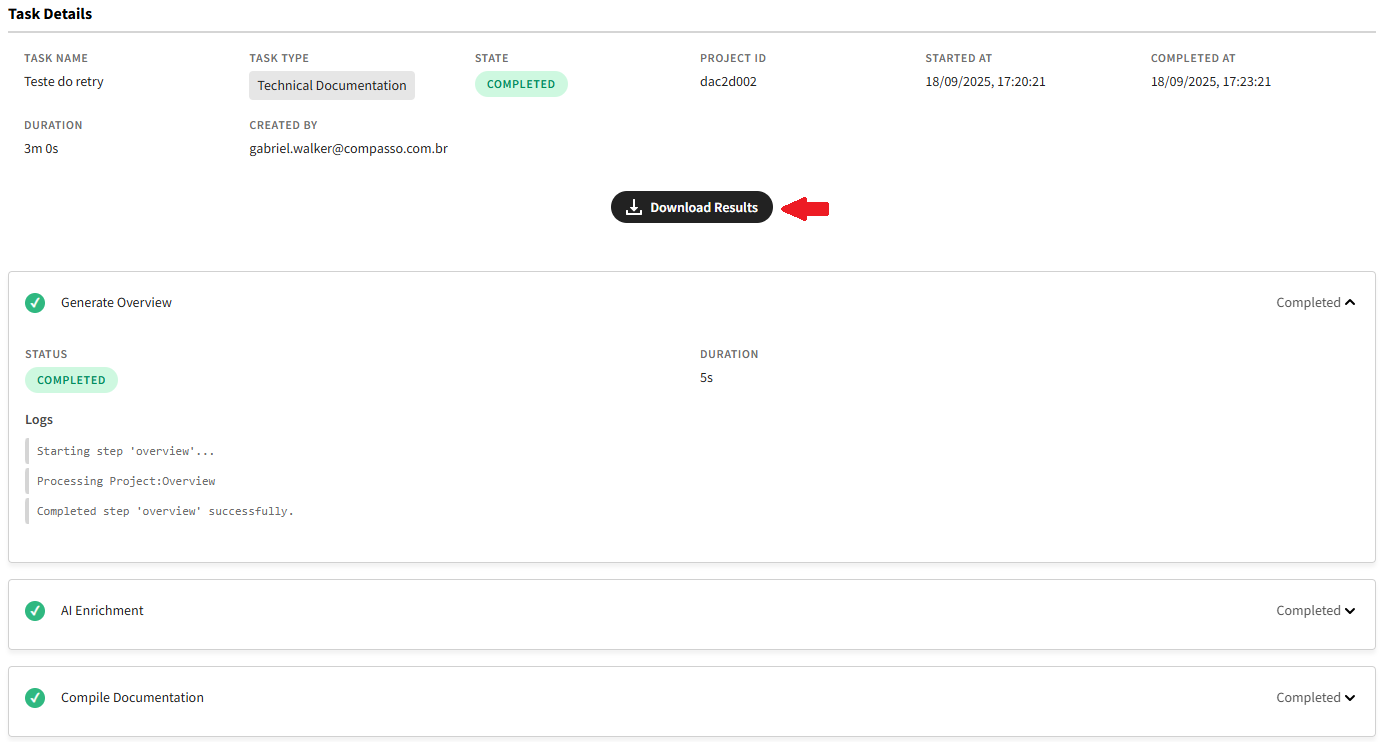 Additionally, the generated documentation is cumulative. For example, if you first run a "Technical Documentation" task and then a "Backlog Generation" task, the second download will contain the information from both tasks.