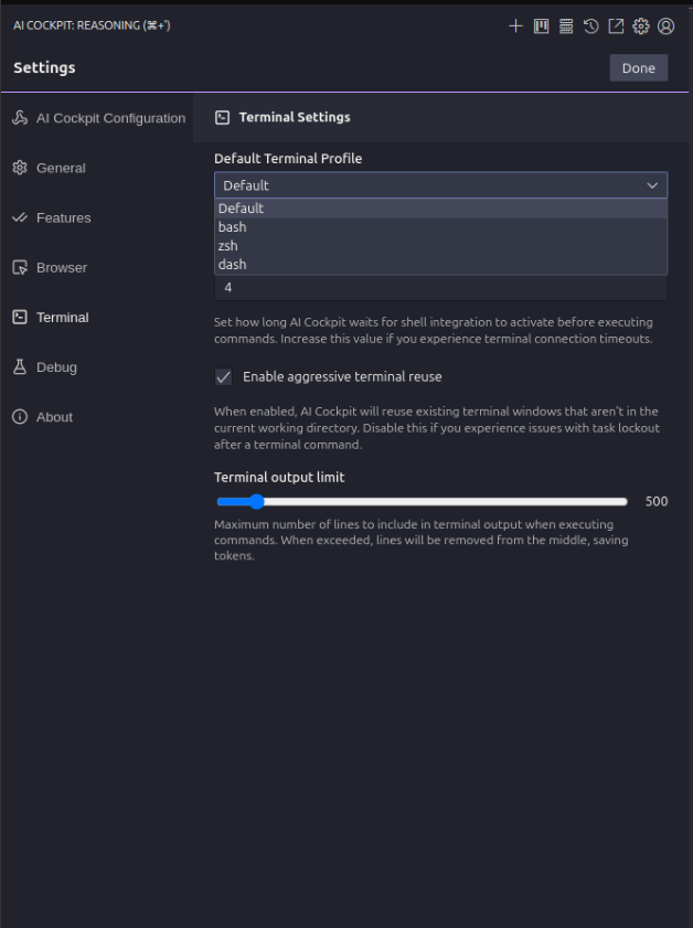 - Select your preferred Default Terminal Profile from the dropdown menu (e.g., bash, zsh, dash).